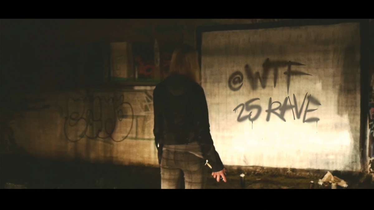 A crowded room. A couch with young people tripping out. Spray paint cans lie on the floor among glasses and cigarettes. Edie heads towards the couch, grabs a spray can on the way. She tags @WTF25RAVE on the wall.