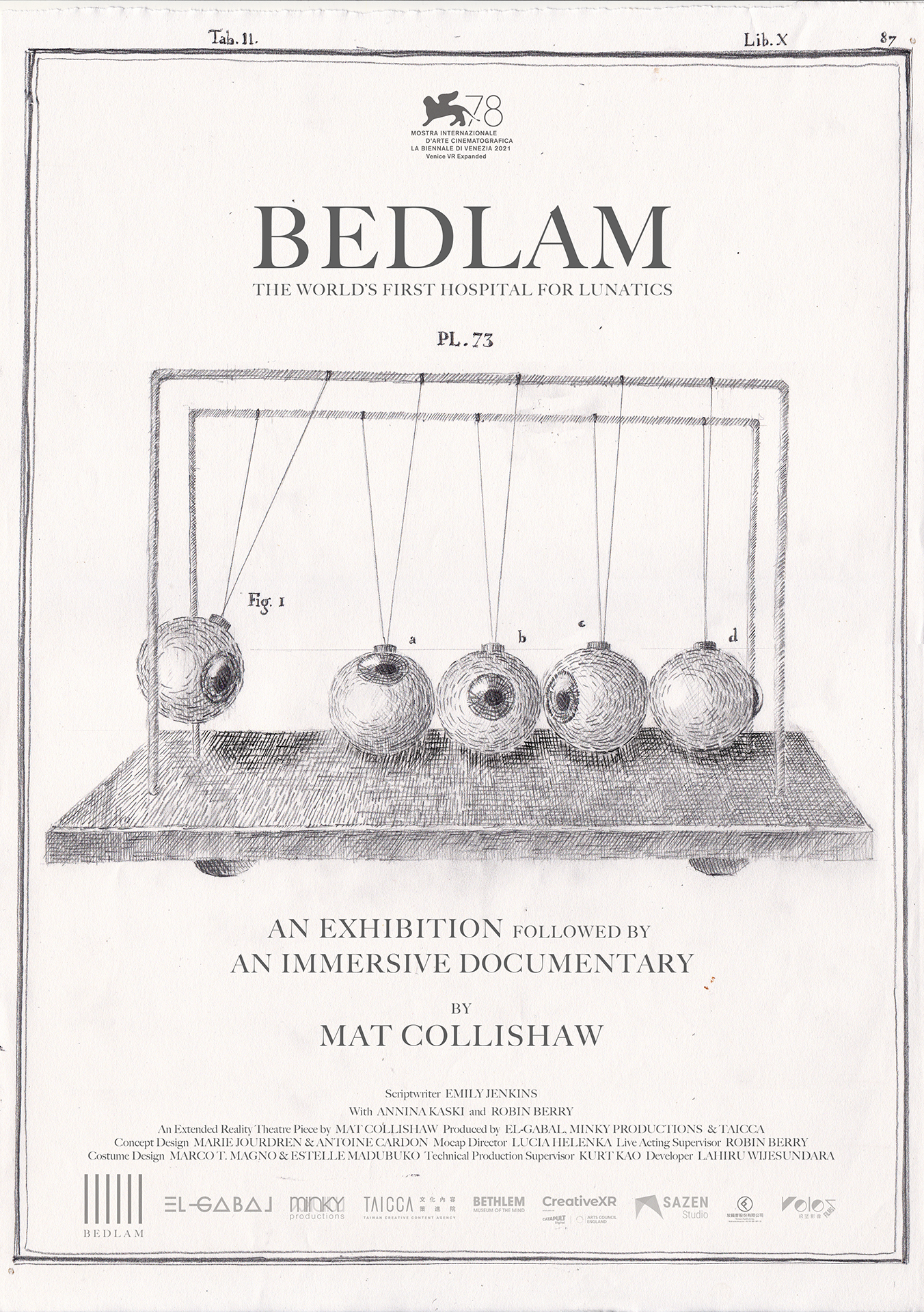 BEDLAM is an XR exhibition followed by a documentary that propels the audience to the very heart of Bedlam asylum as it was in the 17th century: absurd, shocking, chaotic, grotesque, and ultimately poignant.