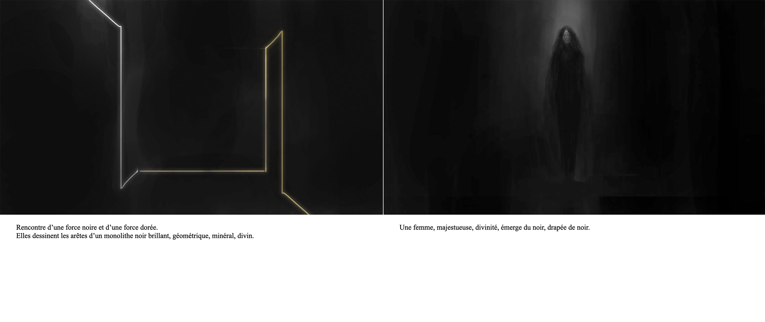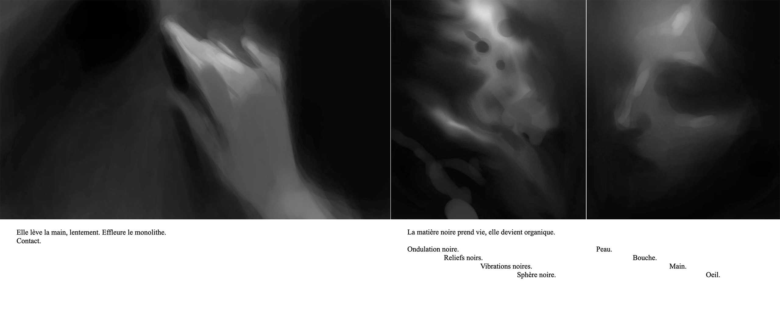 Noir divin. Ton doigt créateur se pose. Tu inities ton incarnation. Noir sensible. Désir vibrant. Clair-obscur des entrailles de la terre. Créateur suprême, matrice première. Noir fertile, gestateur. Organique. Prolifique. Noir de tous les possibles.