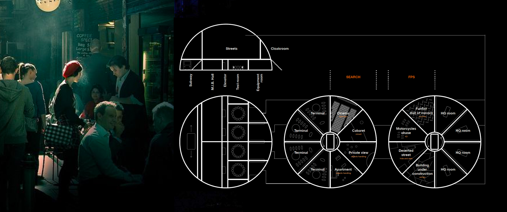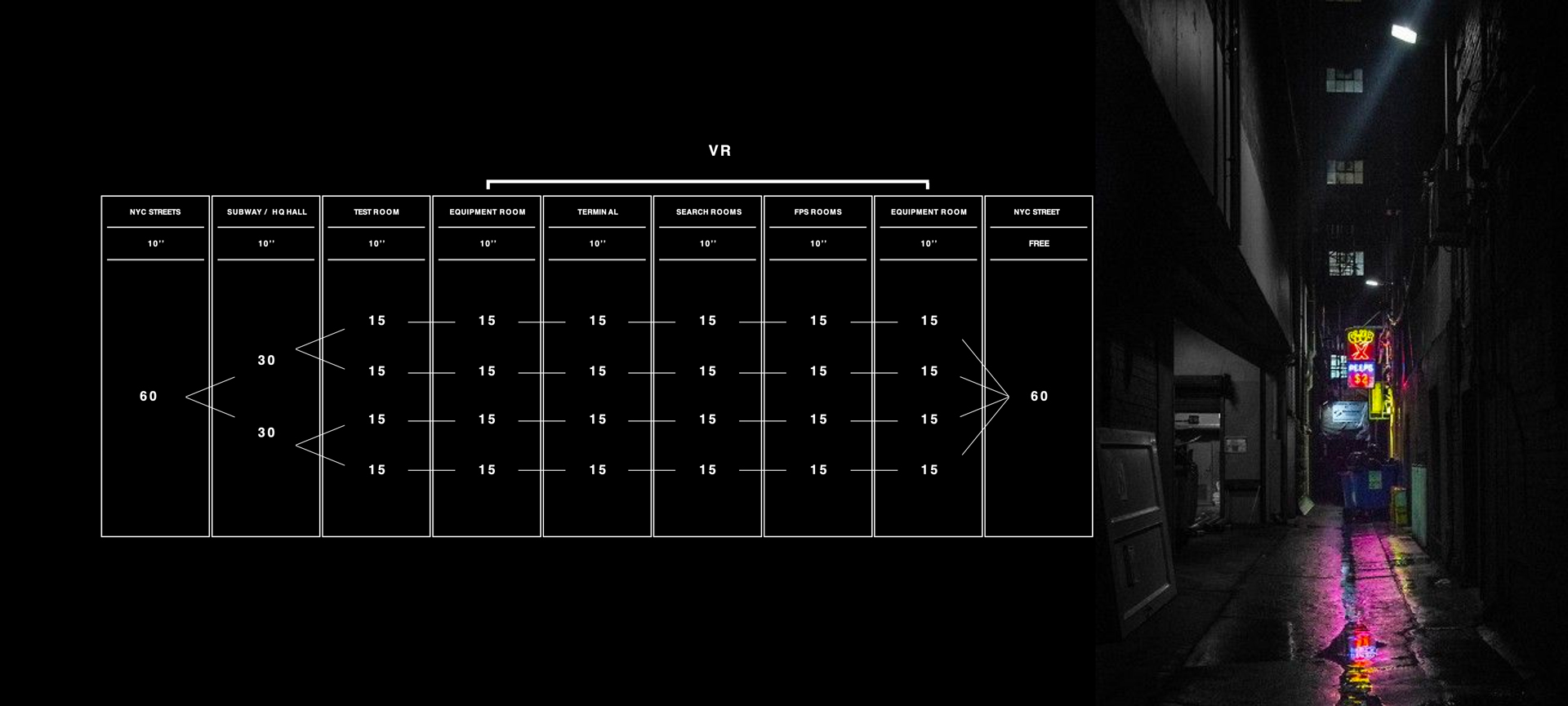 Divided into small groups, viewers experience 4 different scenarios and a series of personalized events through the 60 possible sub-stories. Each scenario lasts 90 minutes, and is composed of a 45’ immersive theater part and a 45’ virtual reality part.